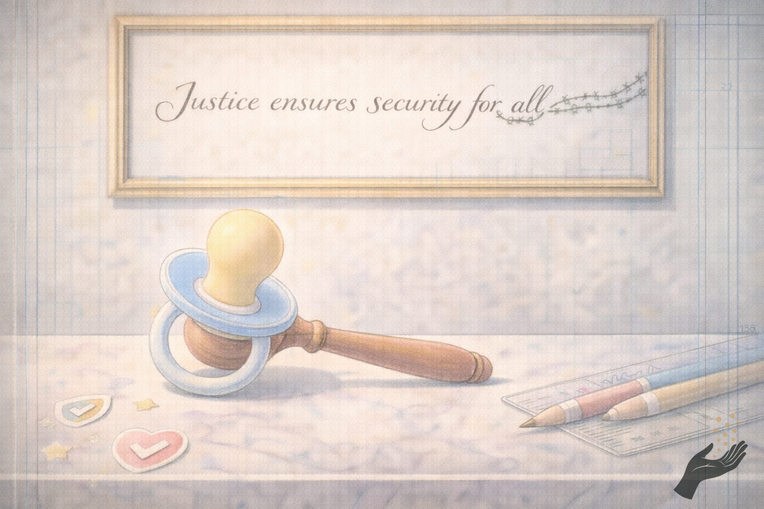 A courtroom gavel rests on stone with a baby pacifier attached, beneath a framed sentence that trails into barbed wire.