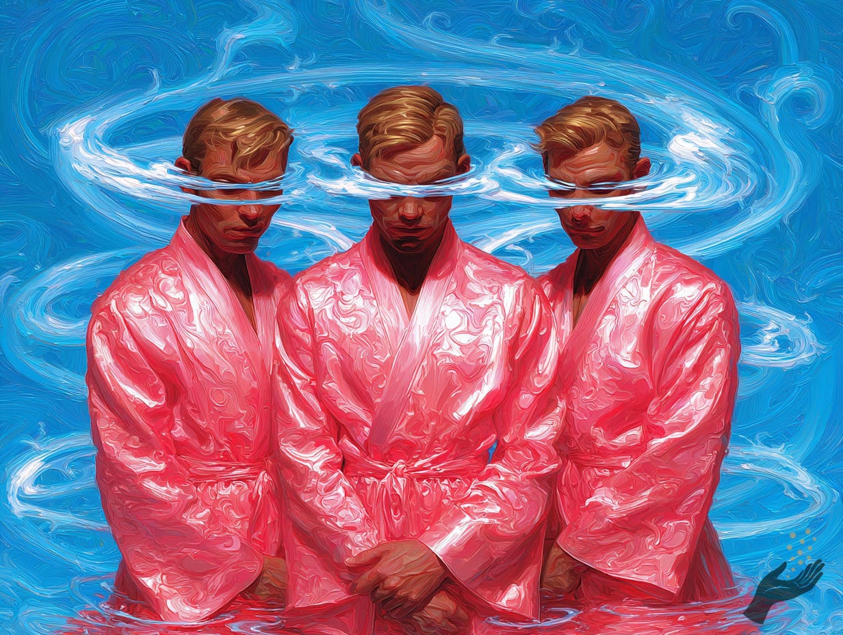 Three figures stand in quiet formation while a pale current passes across their eyes, turning stillness into a shared condition. A clustered body turns within dark rings, holding stillness and motion in the same ritual frame. A figure covers its face while other faces branch outward, turning concealment into a strange kind of proliferation. A doubled figure turns in opposite directions while a hair-like veil passes over the eyes, giving concealment the shape of division. A figure lowers the head while many hands gather around it, turning pressure into a charged form of attention. A many-voiced figure opens into water and air, its repeated faces and gestures giving the scene the force of a living procession. Three figures hold a quiet formation while pale currents pass between them, turning separation into relation. A tightly formed group moves through a whirlpool of water, its shared momentum giving the scene the force of coordinated emergence. Five figures gather in a quiet circle, their lowered faces and stillness giving the water the feel of a threshold. A central figure rises within circling water while looped floral rings turn the scene into a calm act of elevation. A clustered figure settles into blue water while serpent-like strands rise from the head, giving stillness the charge of transformation. A radiant figure opens within a ring of surf, its gathered heads giving the water the force of a living crown.