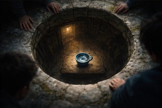 Field Notes — Rim / Door / Cup. Field notes map the dream like a lab: a well as aperture, a cup as belonging, a guide as access, and a descent into…