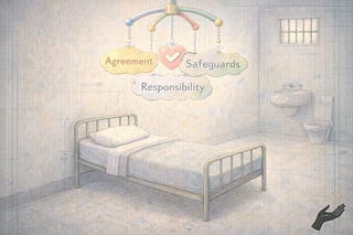 Plate 04. Agreement, Responsibility, Safeguards sway above a cot like bedtime planets. Words teach calm before structure takes shape.