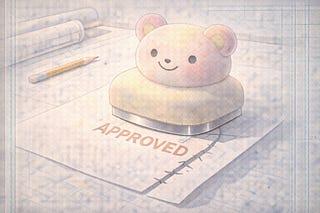 Plate 02. A plush “APPROVED” stamp lands with a smile and leaves a crack. Comfort carries pressure with perfect manners.