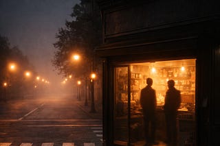Stomari | Process & Drafts (Filed under: Practice). A familiar shop greets me warmly—then the unpaid balance returns, and the intersection outside turns…