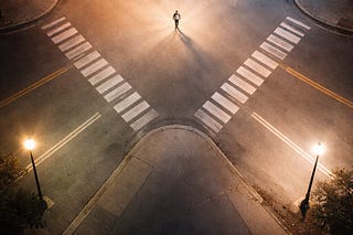 Stomari | Process & Drafts (Filed under: Practice). A person with an unpaid balance crosses an intersection after sight fades, guided by repetition…